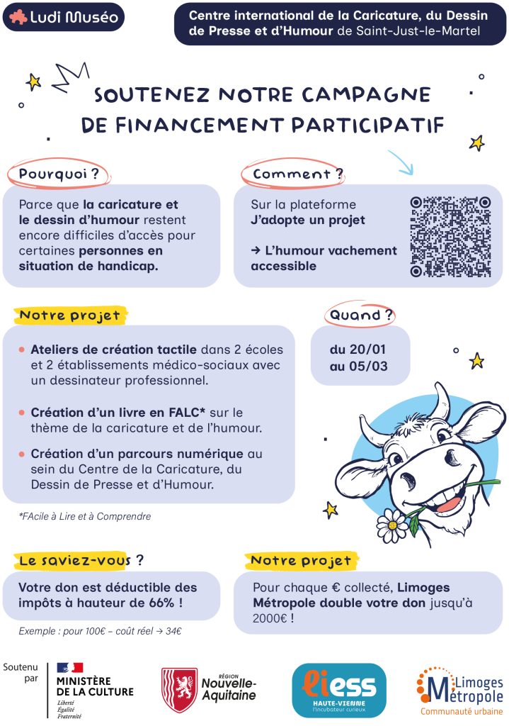 Pour 2026, un projet bien particulier a émergé entre le Centre International de la Caricature, du Dessin de Presse et d’Humour et Ludi Muséo, nous souhaitons rendre l’humour, la satire et la caricature accessibles à tous grâce à :